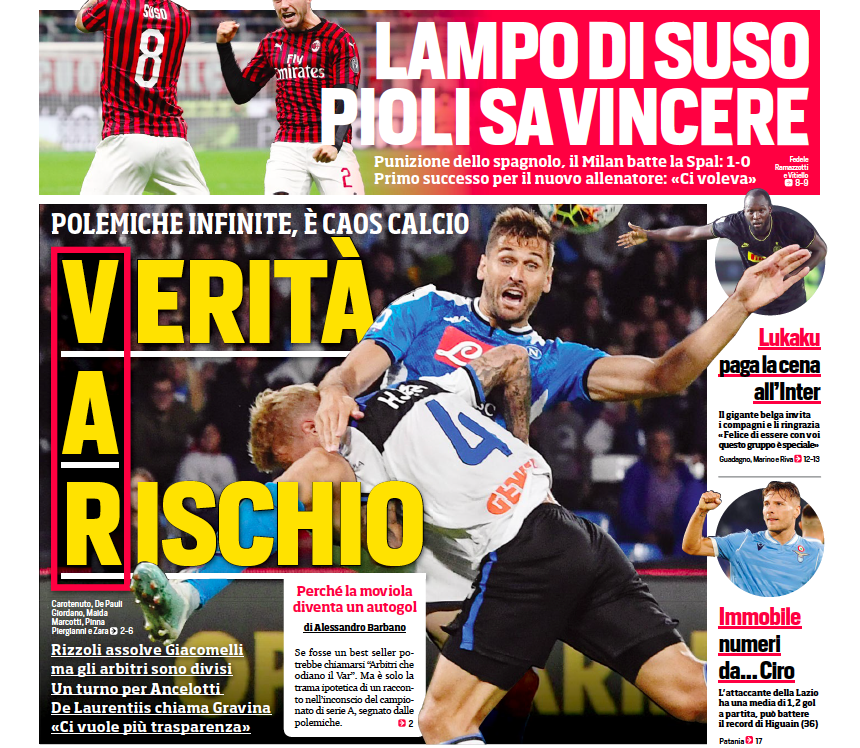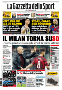 GAZZETTA DELLO SPORT – Il quotidiano in rosa, che parla dell’interrogazione parlamentare incentrata sul VAR per assicurare a milioni di tifosi la regolarità e imparzialità delle gare del campionato di Serie A, torna a parlare dei tre episodi chiave del terzo turno spiegando dove il VAR può intervenire e dove non può farlo. Come già scritto anche dalla nostra redazione ieri, sul secondo giallo a Cassata il VAR viene tagliato fuori. Dal rosso sventolato a Fazio in Udinese-Roma poteva e doveva intervenire, così come avrebbe potuto mutare la scelta di campo in Napoli-Atalanta. Sul fronte Genoa si legge della ormai più che probabile assenza di Kouamè per Napoli-Genoa causata dalla convocazione in Coppa delle Nazioni Africane dall’8 al 22 novembre prossimi nonché del suo ritorno in tempo per affrontare la gara esterna di Ferrara contro la Spal. Si parla anche di Kevin Agudelo come debuttante “mostruoso” in questa stagione di Serie A: viene messo in parallelo con Kulusevski, Kumbulla e Cistana.