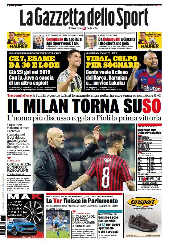 Prime pagine che si alternano fra le polemiche VAR, ancora tutt’altro che azzerate dopo il turno infrasettimanale e arrivate persino in Parlamento con un’interrogazione in aula alla Camera, e l’esaltazione della capolista Juventus, con un’intervista esclusiva a Pjanic su Tuttosport e le statistiche su Cristiano Ronaldo, mai così decisivo nei recuperi di gara per regalare punti pesanti alla Juventus. C’è attesa anche per il derby della Mole in programma domani, in anticipo, e per le decisioni dell’Udinese sul fronte Tudor.