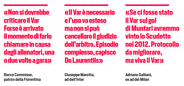 CORRIERE DELLO SPORT – Tra le pagine del Corriere dello Sport è una lunga analisi, non senza polemiche, del VAR e del suo utilizzo, tanto in Serie A quanto negli altri campionato. Da quanto si legge, peraltro, a pagina due del quotidiano viene sottolineato come l’AIA, il suo presidente Nicchi e il designatore Rizzoli vedano un solo errore nell’ultimo turno di campionato: il rosso a Fazio in Udinese-Roma. Nessuna menzione sul placcaggio Kjaer-Llorente o sul rigore di Cristiano Ronaldo in Juventus-Genoa. Si legge anche dell’arbitro