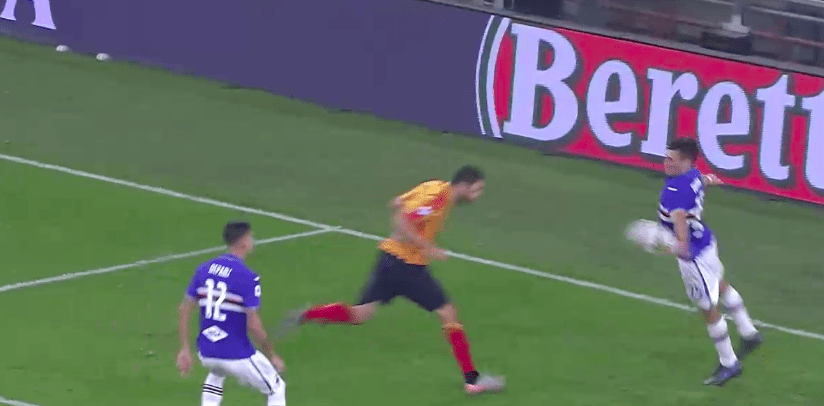 Il primo episodio VAR parte dal “Ferraris”. Alla fine del primo tempo Alex Ferrari è accusato dall’arbitro Massa di aver fermato col braccio sinistro un colpo di testa a porta pressoché sguarnita di Shakhov. L’arbitro estrae immediatamente il cartellino rosso, ma altrettanto immediato è l’intervento del VAR Di Paolo. Il “chiaro ed evidente errore” c’è perché Ferrari, in realtà, colpisce il pallone col fianco e non col braccio. Più di un’angolazione illude sul tocco di braccio (e qui torniamo sul fatidico tema della limitata e ingannevole copertura di camere sul Ferraris rispetto ad altri stadi), ma in realtà quella frontale chiarisce perfettamente la dinamica.