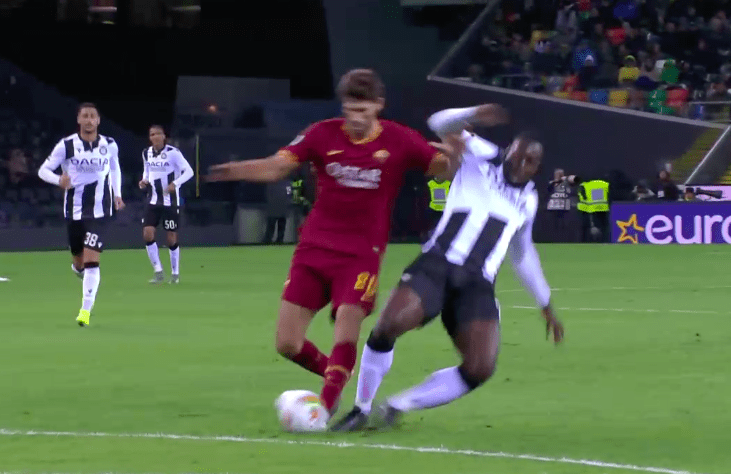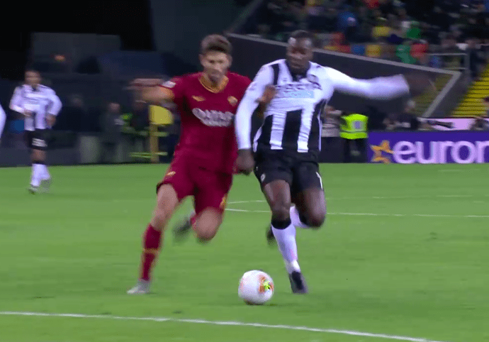 Sufficientemente esplicativo di cosa non vada nel VAR odierno è quanto accade a cavallo tra il minuto 31′ e il minuto 36′ di Udinese-Roma. Okaka viene atterrato da Fazio in una situazione da chiara occasione da gol. L’infrazione punita sarebbe un braccio sinistro a spostare Okaka, 95 chilogrammi di attaccante che cadrà con la leggerezza di una piuma. Irrati non ha dubbi sull’irregolarità, considerando probabilmente un incrocio fra le gambe, ma in realtà non c’è nulla di tutto questo.