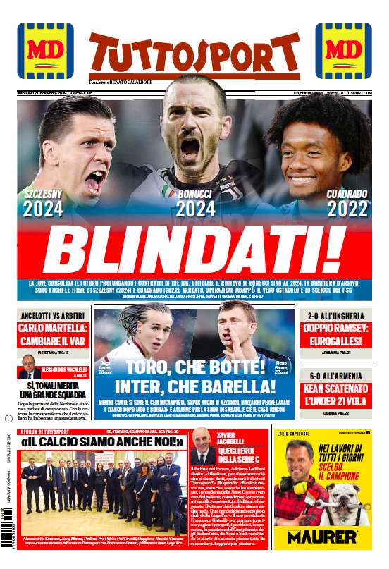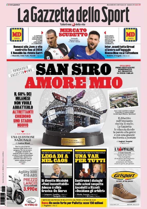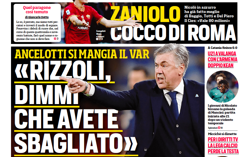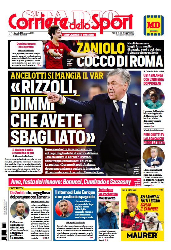 Prime pagine per la questione San Siro: abbattere lo stadio? È davvero quel che vogliono i tifosi? Ieri l’assemblea fra arbitri, dirigenti, allenatori e giocatori: Ancelotti si mangia il VAR criticandone l’operato, Rizzoli fa ammenda e consegna il nuovo regolamento nel giorno in cui anche in Serie B viene annunciato l’ingresso della tecnologia. Micciché si dimette dalla presidenza della Lega Serie A: ora è sfida a due fra Gravina e De Siervo. Luis Enrique si riprende la nazionale spagnola, il commissario tecnico Moreno viene scaricato e nasce un pasticcio mediatico. A Londra via Mauricio Pochettino, il favorito per subentrare al Tottenham è José Mourinho.