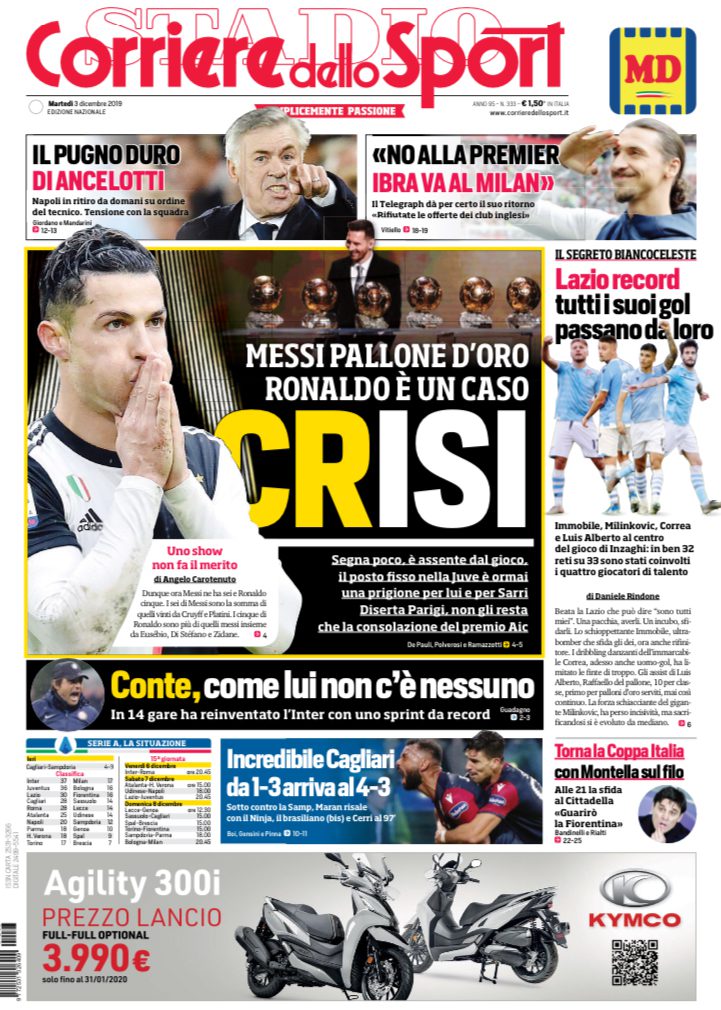 Prime pagine incentrate su Lautaro Martinez dell’Inter, sul sesto Pallone D’Oro conferito a Lionel Messi e su Cristiano Ronaldo, la cui involuzione è evidente e marcata anche dall’assenza alla cerimonia di consegna del premio di France Football. Si parla anche del caos in Lega Serie A, tornata commissariata, e del ritiro voluto da Carlo Ancelotti, che rigetta nel trambusto l’ambiente Napoli.