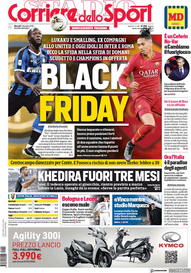 Oltre ai microfoni andrebbero chiuse ogni tanto anche le penne, visto che il titolo di questa mattina del Corriere dello Sport è da rosso diretto e sta scatenando accese polemiche in tutta Italia. Mal digerito da tutta la Serie A, specialmente dopo il comunicato di qualche giorno fa sulle iniziative collettive contro il razzismo, sta raccogliendo la presa di posizione di quasi ogni club del massimo campionato. In particolare di Inter e Roma, che hanno visto coinvolti Lukaku e Smalling riuniti sotto il titolo “Black Friday”. Un gioco di parole e immagini tanto inutile, quanto anacronistico, visto che il Black Friday dovrebbe andare in archivio già con la fine di novembre.