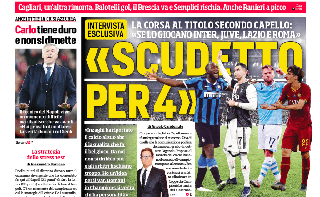 CORRIERE DELLO SPORT – C’è molta Serie A questa mattina sul Corriere dello Sport, che dedica una posizione ampia dell’analisi alla moviola a Lecce-Genoa. Considerato regolare il primo gol del Genoa (Pinamonti è a 5/6 metri da Gabriel ed è una distanza che la FIFA ha spiegato essere ininfluente nella valutazione), corretta la decisione del doppio giallo a Pandev. Sul fronte pagelle, oltre alla sottolineatura delle parole di Thiago Motta e Liverani (non soddisfatto del primo tempo), vengono premiati Criscito (migliore in campo con 7), Pandev e Romero. Sei e mezzo anche per il tecnico rossoblu così come per l’arbitro Rocchi.