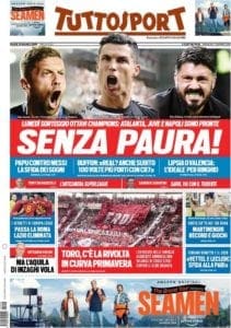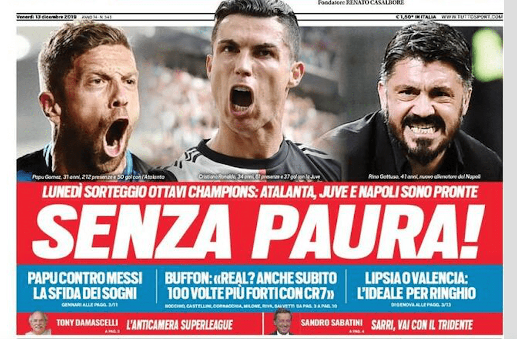 Lunedì sono in programma i sorteggi degli Ottavi di Finale di Champions League, dove a sorpresa è entrata (oltre a Napoli e Juventus) anche l’Atalanta di Percassi e Gian Piero Gasperini: le prime pagine sono ancora ampiamente dedicate all’impresa della Dea. Da un nerazzurro all’altro: l’Inter giocherà i sedicesimi di Europa League insieme alla Roma. Lazio eliminata. Gattuso si insedia al San Paolo, più di un addetto ai lavori consiglia a Sarri di lanciare il tridente Dybala-Ronaldo-Higuain. La Curva Primavera del Torino nel caos: svariate famiglie hanno richiesto di portare la società granata in tribunale per gli scontri avvenuti lo scorso 23 novembre.
