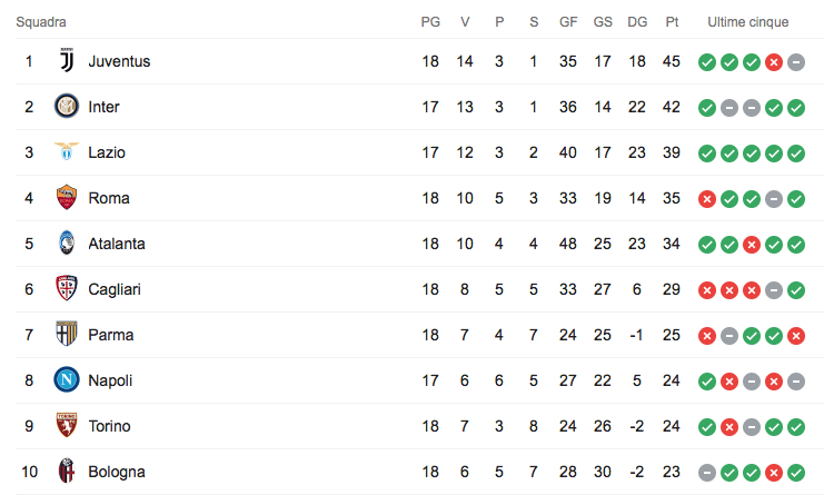 CRIS FA TRIS – La prima tripletta di Cristiano Ronaldo riporta i bianconeri in testa, aspettando il risultato di Napoli-Inter in programma questa sera. CR7 sblocca una partita tirata contro il Cagliari ad inizio ripresa, trasforma un rigore conquistato da Dybala e chiude la pratica su assist dell’ultimo entrato Douglas Costa. Nel mezzo una rete di Gonzalo Higuaìn. Nella terza partita in programma alle ore 15, l’Atalanta di Gasperini travolge con un perentorio 5-0 anche il Parma riportandosi al quinto posto in classifica a un solo passo dalla Roma, sconfitta nella serata di ieri dal Torino. La Dea mette in ghiaccio la partita già nel primo tempo, Ilicic appesantisce il risultato con una doppietta superata l’ora di gioco. Chi è sempre più difficile da superare, dopo la fiammata di entusiasmo portata dalla qualificazione agli Ottavi di Champions League, è proprio l’Atalanta.