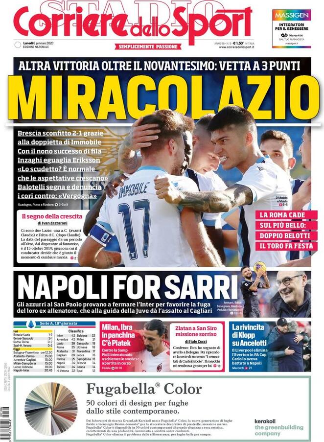 CORRIERE DELLO SPORT – Una rete rocambolesca di Pandev permette al Genoa di dare una spallata alla paura e lasciare l’ultimo posto in classifica. Il Sassuolo di De Zerbi, che non perde mai la bussola in campo ma aspetta fino all’infinito per sferrare il colpo del KO (annullato dal VAR), a fine partita non ci sta: “Dell’arbitraggio meglio non parlarne” tuona l’amministratore delegato neroverde Carnevali. Voto 5 all’arbitro e al VAR, mentre i giocatori genoani – da Criscito e Sturaro – si guadagnano più di un 7 in pagella.