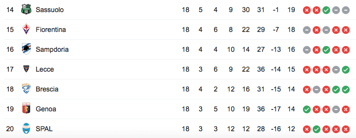 Dopo gli anticipi della giornata di ieri, il 18º turno di Serie A offriva all’ora di pranzo l’esordio di Iachini sulla panchina della Fiorentina contro il Bologna di Sinisa Mihajlovic. Alle 15 il Milan ospita la Sampdoria, la Juventus il Cagliari e l’Atalanta di Gasperini il Parma. Alle 18 in campo Lecce-Udinese, stasera (ore 20.45) Napoli-Inter.