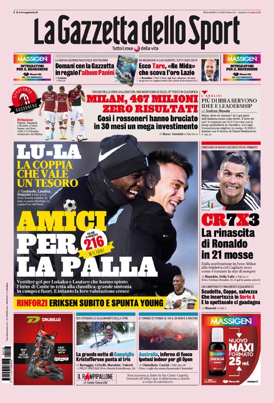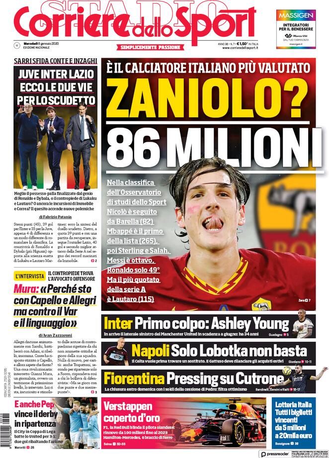 CORRIERE DELLO SPORT – Il Corriere dello Sport nella sua edizione odierna comincia dal ritornare un po’ indietro, all’estate, proponendo una classifica delle spese estive fatte dalle venti società di Serie A per rinforzarsi. Il Genoa è al nono posto con cinquanta milioni di euro. Si torna presto all’attualità e per il Genoa c’è un unico richiamo a pagina 23, dove si legge di un possibile ritorno in rossoblu – l’ennesimo dopo Perin, Behrami e Destro – di Iago Falque. Qualche rapido accenno alla sfida di domani sera valida per gli ottavi di Coppa Italia, ma nulla più, e un trafiletto dedicato all’inchiesta dell’Antitrust sulle clausole vessatorie che 9 club imporrebbero ai loro tifosi una volta sottoscritti abbonamenti o acquistati tagliandi per la singola partita (clicca QUI per saperne di più).