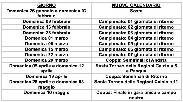 Domenica 26 gennaio e domenica 2 febbraio le squadre non scenderanno in campo, ma si riprenderà domenica 9 febbraio con la prima giornata di ritorno. Da lì in avanti si proseguirà settimanalmente fino al 22 marzo, quando si concluderà il campionato d’Eccellenza, un viatico importante per cercare di raggiungere la Serie C. Le semifinali di andata di Coppa Italia si disputeranno il 29 marzo, col Genoa impegnato in trasferta col Don Bosco Valle Intemelia. Il ritorno sarà programmato dopo Pasqua, domenica 19 aprile, dopo un’ulteriore sosta di due settimane. La finale, quindi, sarà prevista il 10 maggio prossimo in campo neutro. Si ricorda come la vincitrice della competizione riceva il pass per accedere alla fase finale della Coppa Italia nazionale.