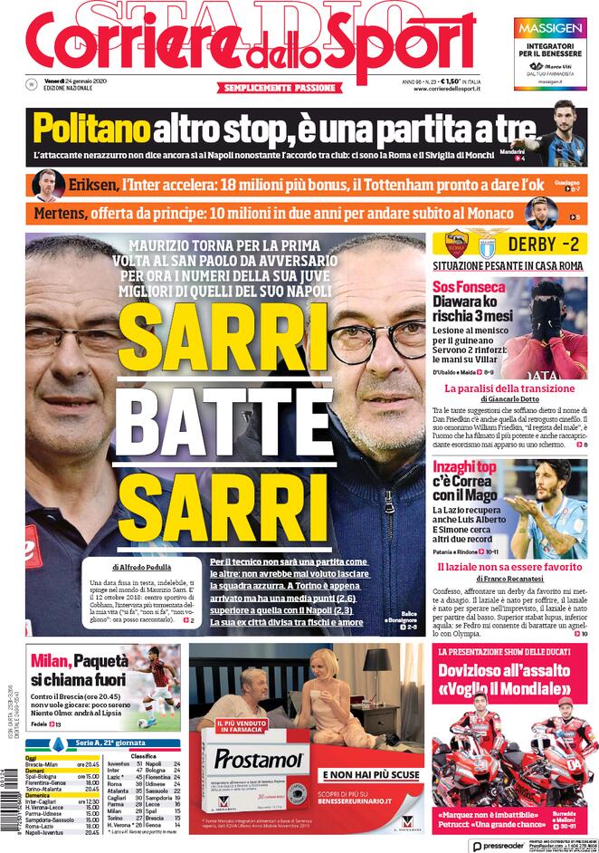 IL SECOLO XIX – Negli ultimi 2 anni sono state solamente 4 le vittorie in trasferta: 3 con Ballardini ed una sola sotto la gestione Prandelli. Romero si sposa in Comune, ma la festa è rinviata a fine stagione. Lavori finiti al Signorini di Pegli, che sarà inaugurato con tutta probabilità nelle prime settimane di Febbraio. Ufficiale Eriksson, che è stato voluto fortemente dal ds Marroccu e che al quotidiano genovese racconta la grande amicizia con Astori, conosciuto ai tempi del Cagliari e di cui si è tatuato la maglia numero 13 sul polpaccio: “Davide è stata la persona che più mi ha insegnato in campo”. Masiello invece firmerà fino al 2022 e tornerà a titolo definitivo per 2 milioni di euro, valutazione non da poco per un giocatore vicino ai 34 anni. A Milano vertice di mercato fra Preziosi, Nicola, Marroccu e Donatelli: in attacco corsa al pupillo Younes (ha offerte da Torino, Samp e squadre straniere) e a Iago Falque, che spinge per un ritorno e le cui quotazioni stanno salendo giorno dopo giorno. Non si fa menzione dell’operazione Parigini, mentre viene confermato l’interesse per Retsos.
