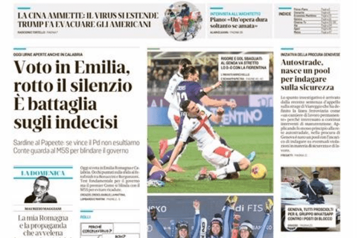 TUTTOSPORT – A Firenze il Genoa osserva i miracoli di Dragowski e si morde le mani per le occasioni sprecate. Paura per Castrovilli, che chiede il cambio stordito da un forte giramento di testa. Iachini: “Stiamo guarendo ma siamo stati troppo lenti”. Nicola: “Ci siamo espressi da squadra vera”. I migliori in campo sono i portieri: il poacco della Fiorentina prende addirittura 8,5 mentre Perin si deve accontentare del 7. I peggiori in campo sono Venuti, Pezzella e Pinamonti. Il Torino ha chiesto i giovani Flavio Bianchi ed Eboa Ebongue in cambio di Parigini, ma la trattativa va per le lunghe. Tanto Preziosi quanto Cairo faticano a concretizzare le uscite: ecco perché l’esterno offensivo potrebbe restare in maglia granata fino a giugno. Da un esterno all’altro, anche su Iago è forte il pressing rossoblu, cui si aggiungono le offerte di SPAL, Espanyol ed Al-Nasr. L’Atalanta a breve perderà Masiello, per il quale si attende solamente la chiusura dell’affare.