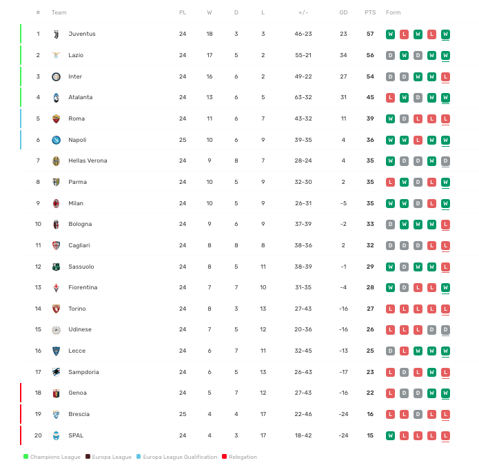 La 25ª giornata di Serie A è cominciata di venerdì sera allo stadio Rigamonti, dove sono scese in campo Brescia e Napoli. Impegnata in Champions League martedì sera contro il Barcellone, la formazione di Gattuso era reduce dalla vittoria in casa del Cagliari; i padroni di casa, invece, dalla sconfitta allo Stadium con la Juventus.