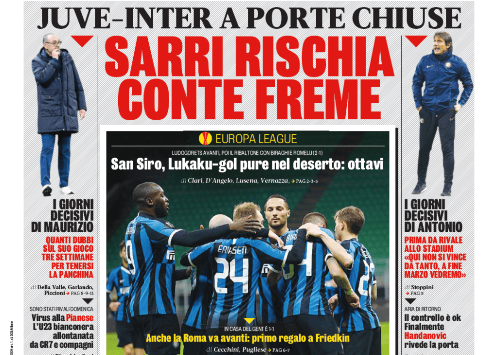 GAZZETTA DELLO SPORT – Si passa poi al quotidiano in rosa, dove si parla anzitutto del turno che è stato confermato a porte chiuse, così come dello spostamento a sabato (ore 15) di Brescia-Genoa (clicca QUI per il dettaglio delle variazioni e le date dei recuperi). Poi si affrontano i cambiamenti del Milan da un girone all’altro. La gara d’andata col Genoa segnò la fine della parentesi Giampaolo: domani in panchina ci sarà Stefano Pioli, che ha mutato sia lo schieramento tattico sia la classifica rossonera. Un tecnico, quello del Milan, che dovrà con ogni probabilità rinunciare a Donnarumma (pronto Begovic) e che dovrebbe puntare ancora una volta su Gabbia come centrale difensivo in coppia con Romagnoli. Sul fronte Genoa, nello specifico, si parla soprattutto del ritorno di Cristian Romero, l’uomo che fermò all’esordio CR7 allo Stadium. La Gazzetta rilancia dunque il suo ritorno nella difesa a tre, pronto a vedersela con Ibrahimovic. Biraschi, a quel punto, avanzerebbe a centrocampo.