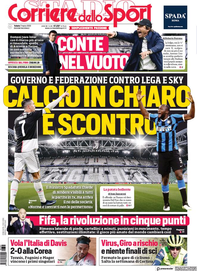 L’emergenza Coronavirus fa saltare o rinviare altri eventi sportivi. Non si correranno infatti la Milano-Sanremo e la Tirreno-Adriatica, così come sono state annullate le finali di coppa del mondo di sci inizialmente in programma a Cortina. Il governo consiglia di trasmettere in chiaro le partite delle prossime giornate, trovando contrarie Sky e la Lega Serie A: “Il contratto non lo permette”. A meno che non arrivi un decreto ministeriale ad hoc. La FIFA starebbe valutando 5 nuove regole da adottare nel calcio a partire dalle prossime stagioni: rimessa laterale di piede, punizioni in movimento, tempo effettivo, sostituzioni illimitate e cartellini a tempo.