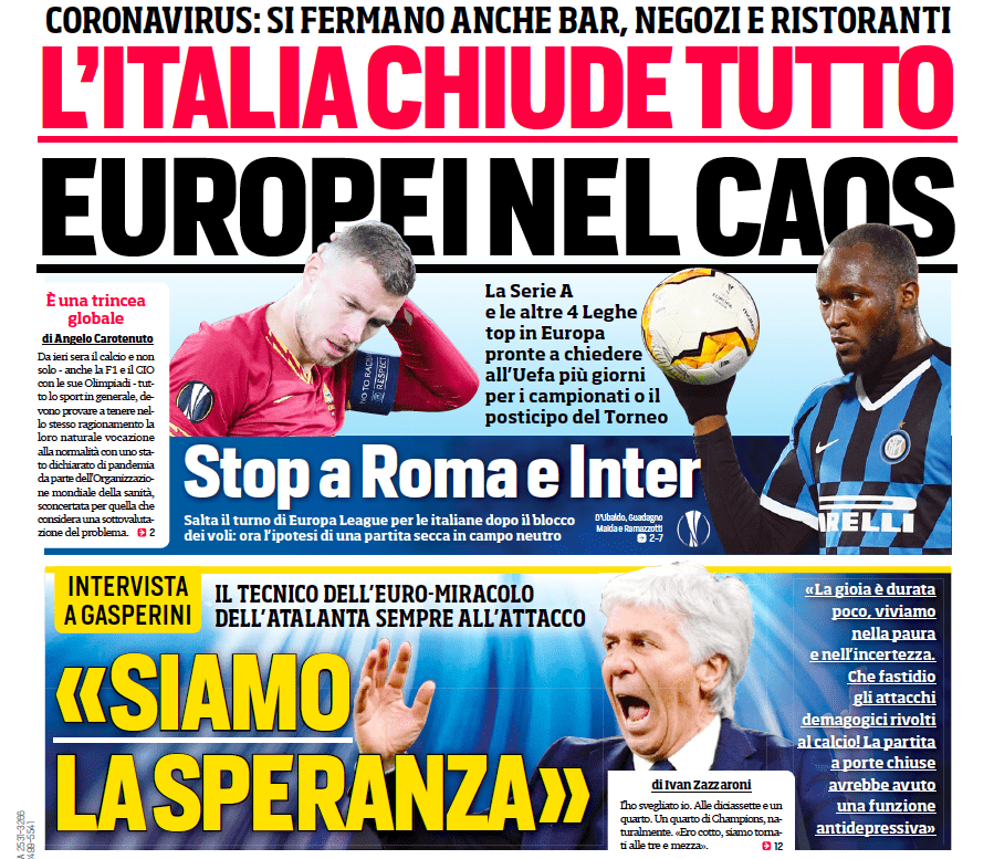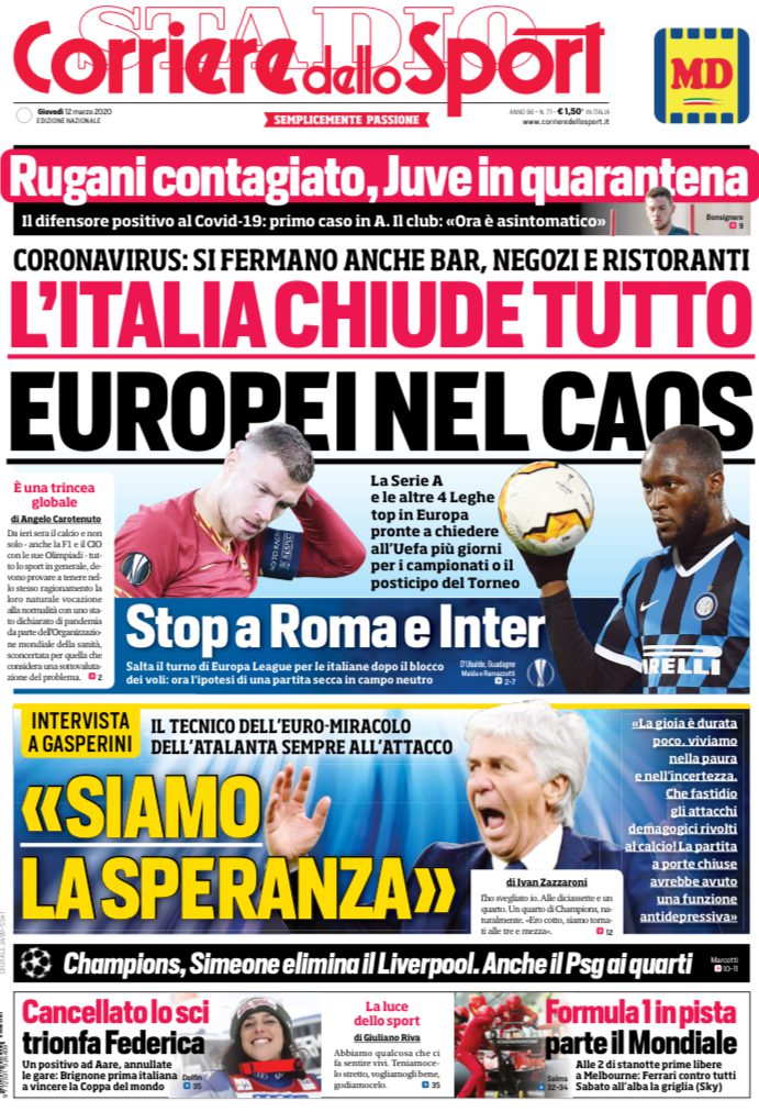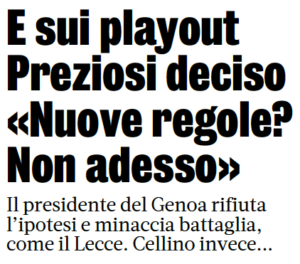 GAZZETTA DELLO SPORT – Prosegue nel medesimo filone anche il quotidiano in rosa, che riporta anche le parole di Enrico Preziosi, presidente del Genoa, che non ha alcuna intenzione di perseguire l’idea playout e percorrere, invece, quella della conclusione dei campionati secondo i regolamenti noti a tutti prima dell’inizio della stagione. “L’obiettivo prioritario è superare l’emergenza sanitaria – puntualizza subito il presidente del Genoa
