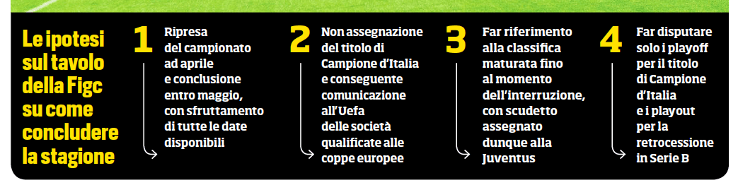 riportato dalla Gazzetta dello Sport – ma per quanto riguarda il campionato la volontà di tutti resta portarlo a termine. È l’orientamento che prevale nelle varie conference call tra noi presidenti. Non si possono imporre oggi regole nuove, mai utilizzate, diverse da quelle che conoscevamo in partenza. Non è previsto in alcun modo. Ed è sbagliato a livello di principio oltre che nella pratica: chi come noi ha investito molto a gennaio vuol vedere riconosciuti i proprio sforzi sul campo secondo le regole note a tutti“. In un approfondimenti ulteriore del quotidiano si legge che playoff e playout sarebbero solamente “soluzione estrema“. Domani un vertice telefonico molto simile ad un’assemblea di Lega, il tutto mentre presidenti e dirigenze si tengono quotidianamente in contatto in vista della riunione fissata per il prossimo 23 marzo. Fra i più assenti (ieri addirittura non si sarebbe fatto trovare) c’è il presidente del Brescia, Cellino. Questo latitare sarebbe interpretabile, secondo la Gazzetta, come una strategia: i playout ovviamente garantirebbero alla formazione bresciana, ultima in classifica, di avere ancora qualche chance di permanenza in Serie A, così come la avrebbe la Spal penultima.