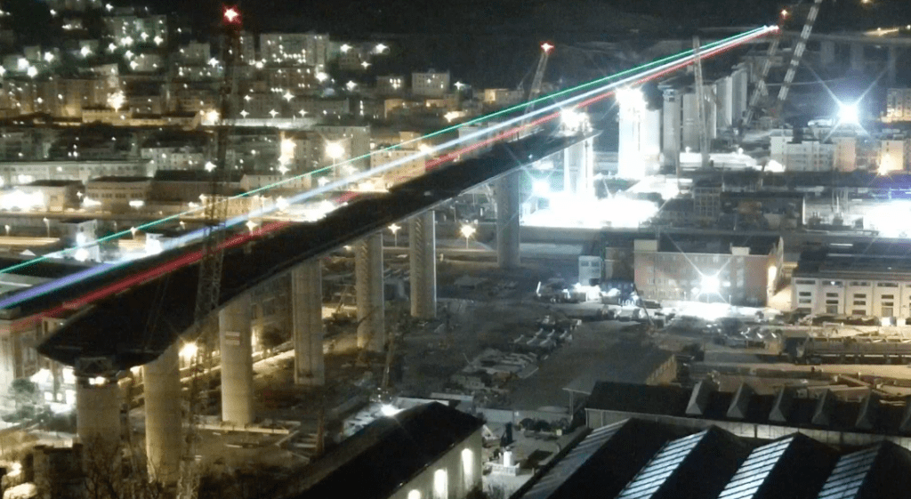 Un fascio di luci tricolore splende sulla val Polcevera dalle 19.30 di questo difficile sabato per il Paese: dal troncone est al troncone ovest, la tratta del nuovo Ponte è illuminata dai colori della bandiera italiana che ogni giorno, al calar del sole, risplenderanno sul futuro ponte (clicca QUI per vedere la diretta dell’evento).