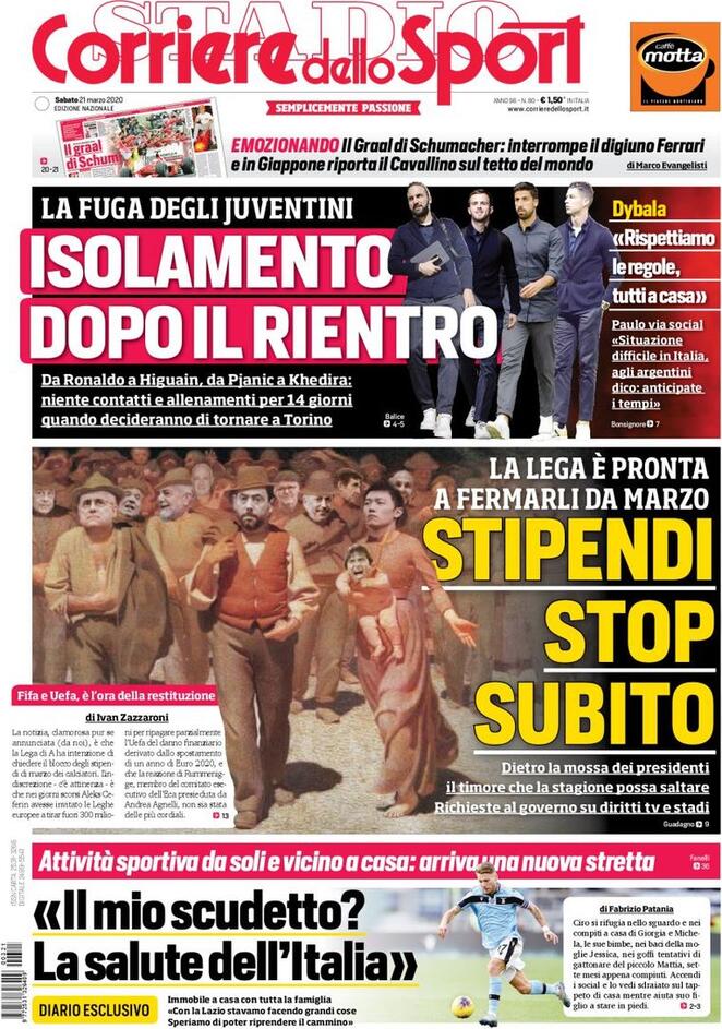 Il Corriere dello Sport punzecchia Cristiano Ronaldo, rimasto in Portogallo e colpevole di aver “aperto la strada” all’esodo di altri tre giocatori bianconeri (Higuain, Pjanic e Khedira) verso altri paesi violando così il regime di quarantena imposto dal governo italiano. CR7 detta le regole? Tutti e quattro dovranno scontare un regime di isolamento di 14 giorni non appena faranno ritorno a Torino: “Mi auguro che chi ha assunto questa decisione abbia effettuato un’attenta valutazione anche sul piano legale” sono le parole dell’avvocato Romanelli all’interno delle pagine dedicate alla Juventus.
