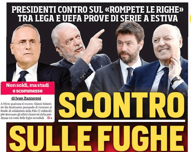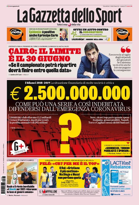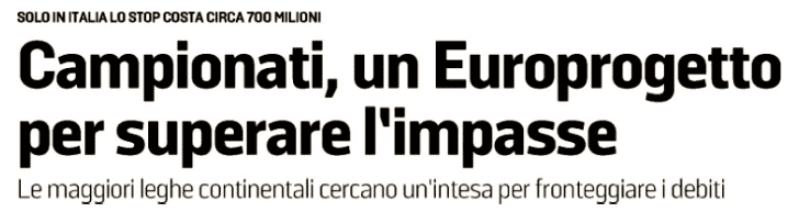 In Serie A il nodo sulla ripresa o meno del campionato resta eccome: uno stop costerebbe perdite per circa 700 milioni di euro, si studia un piano economico tripartito (Serie A, B e C) da presentare al Governo. Mentre UEFA ed ECA cercano una soluzione per terminare le competizioni internazionali Lotito chiede a gran voce i playoff. Percassi e De Laurentiis vorrebbero terminare la stagione, Genoa e Sampdoria si oppongono ai playout in compagnia di tutte le squadre di bassa classifica. Se la stagione non finisse, l’idea di molti presidenti è di chiedere ai giocatori un taglio del 30% dei loro stipendi, per tamponare una parte dei diritti televisivi mancanti con una cifra vicina ai 300 milioni di euro.