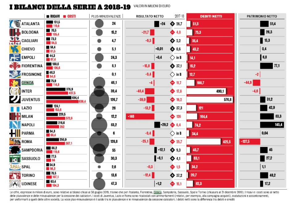 GAZZETTA DELLO SPORT – Cresce il fatturato ma con lui anche i costi: come può un campionato così indebitato come la Serie A difendersi dall’emergenza Coronavirus? Se la stagione non riprende – sottolinea la rosea in prima pagina – si rischia il collasso fra spese, stipendi e trasferimenti. Mentre gli incassi derivanti dagli stadi restano indicativamente gli stessi, i proventi dai diritti televisivi sono saliti da 1,3 miliardi a 1,44 miliardi anche grazie alla Juve di Cristiano Ronaldo e alla crescita dell’Inter, che ora temono una battuta d’arresto proprio nel bel mezzo della loro fase espansiva. Cairo non ha dubbi: “Se il campionato dovesse ripartire, gli allenamenti vanno ripresi insieme e va terminato entro il 30 giugno”. Se le due genovesi ricavano importi simili dai diritti televisivi, il Genoa nella stagione 2018/2019 presentava un debito netto pari a circa 100 milioni di euro. I conti della squadra di Preziosi migliorano grazie alle ricche cessioni, su tutte quelle di Piatek e Pellegri. La gestione ordinaria viene definita “squilibrata”, corretta solamente dalle operazioni di mercato che ne ripristinano anche l’integrità patrimoniale. L’esercizio 2019, ancora da approvare, beneficerà anche dei 26 milioni derivanti dalla cessione di Romero, elemento che potrebbe venire utile ai bianconeri solamente in caso di cessione di Rugani. Chi invece resterà un altro anno a Genova è Goran Pandev, pronto a rinnovare contratto e sfida con la Macedonia: l’obiettivo è portarla con un anno di ritardo agli Europei del 2021.