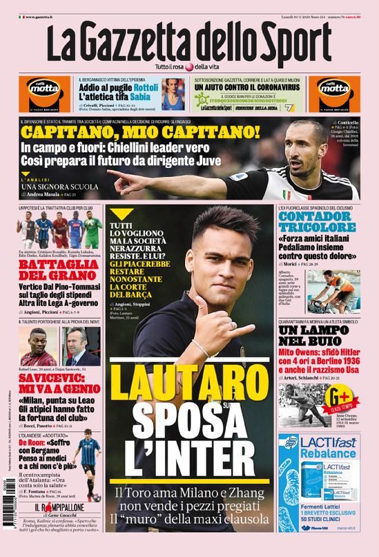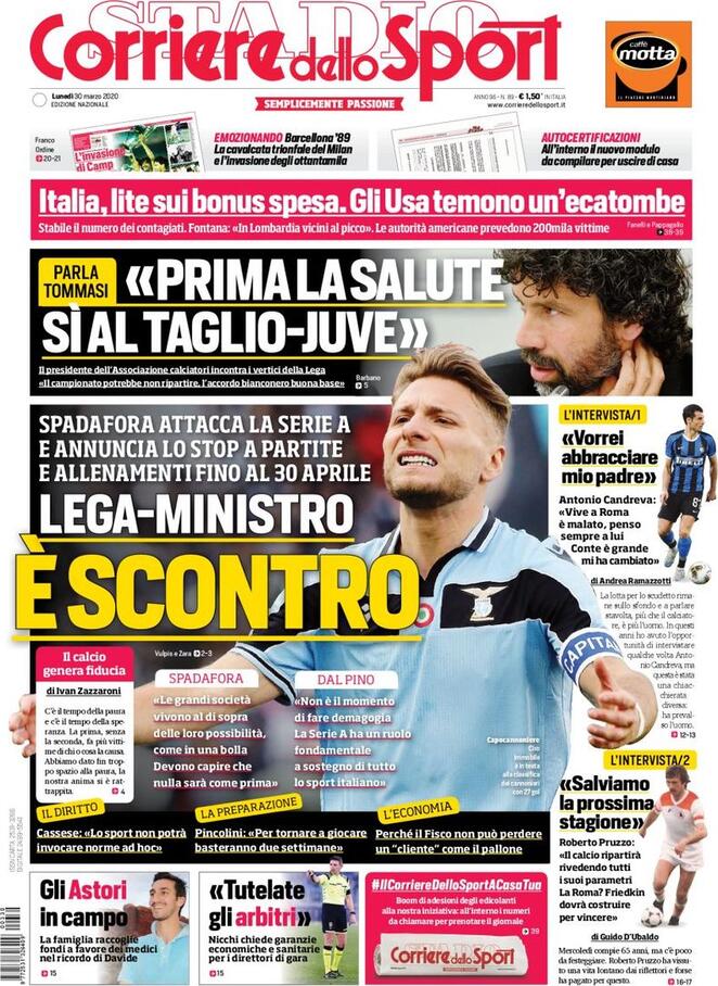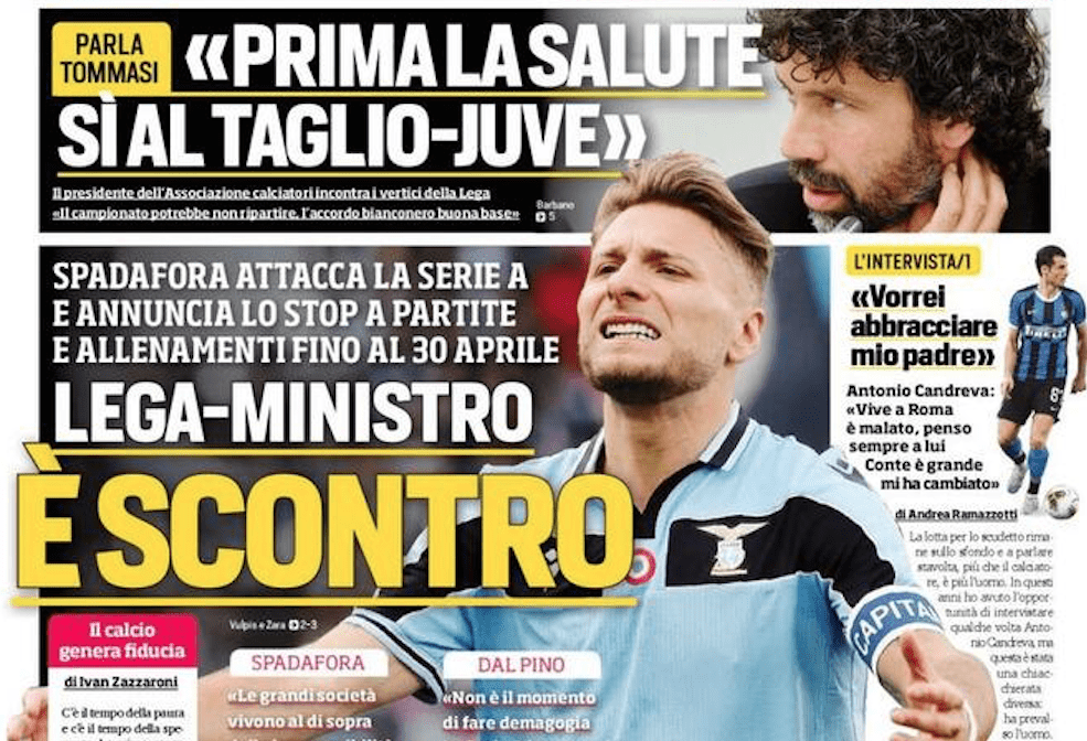 I quotidiani sportivi italiani puntano il dito sul dissidio sempre più evidente fra i vertici della Serie A e il ministro dello sport Vincenzo Spadafora, che nella giornata di ieri ha annunciato che lo stop fino al 30 aprile sarà esteso anche alle attività di allenamento, misura restrittiva che non fa altro se non allontanare la possibilità di portare a termine il campionato. A mezzo stampa arriva la risposta di Dal Pino: “Non è il momento di fare demagogia, il nostro movimento porta ricchezze e risorse”. Mentre i presidenti si dividono fra chi sta con Spadafora (Cellino) e chi vuole finire a tutti i costi la stagione (Setti), è la Serie B il vero ago della bilancia. Se il Benevento rivendica la promozione, il presidente del Pescara Sebastiani propone di promuovere i giallorossi e tutelare gli interessi di Monza, Vicenza e Reggina, prime in classifica nei rispettivi gironi di Lega Pro. Oggi è previsto anche un vertice con Tommasi: si va verso una riduzione degli ingaggi. Molti club non hanno fretta e attendono di capire quali saranno le sorti del campionato, mentre la Roma vuole allinearsi alla Juventus e il Brescia potrebbe annunciare un accordo con i giocatori già nelle prossime ore, Damiani fa sapere: “Niente pagamenti se non si torna a giocare”.