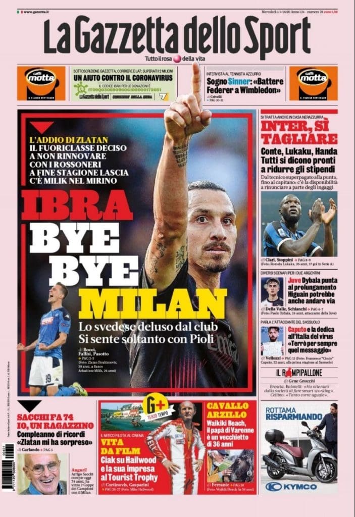 Chiude la Gazzetta dello Sport, che in prima pagina parla soprattutto dell’ormai quasi scontato addio di Ibrahimovic al Milan e dell’azione dell’Inter sul fronte stipendi: intesa coi giocatori per un taglio di cui le casse nerazzurre beneficeranno per circa 20 milioni di euro. All’interno del quotidiano in rosa si tratta ancora del fondo FIFA per aiutare le federazioni di tutto il mondo. E, all’interno di un breve trafiletto, si legge della proposta della FIFPro, sindacato internazionale dei calciatori. “Chiudere la stagione ed estendere i contratti” è la proposta del sindacato, che spiega come “bisognerebbe interpretare il contratto immaginando che la durata sia dall’inizio alla fine della stagione“. In altre parole: finché la stagione non è conclusa con le ultime gare da disputare i contratti rimangono in essere, anche se fossero andati in scadenza al 30 giugno. FIFPro, ad ogni modo, non esclude che a monte dovrebbe esserci una trattativa attenta a livello legale e burocratico.