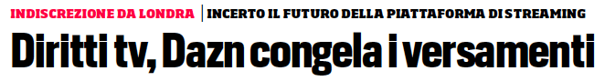 Non da meno, sempre nell’edizione del Corriere dello Sport, l’indiscrezione secondo cui DAZN sarebbe pronto a non liquidare la restante parte dei diritti televisivi alla Serie A. “Dazn liquiderà i servizi che gli sono stati consegnati, mentre non lo farà per eventi o partite di competizioni sospese, rinviate o annullate – si legge sul quotidiano sportivo. “E soprattutto: altro che anticipi sulla stagione 2020-21, i rubinetti resteranno chiusi finché non vi sarà chiarezza sui calendari“.