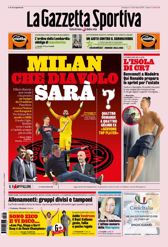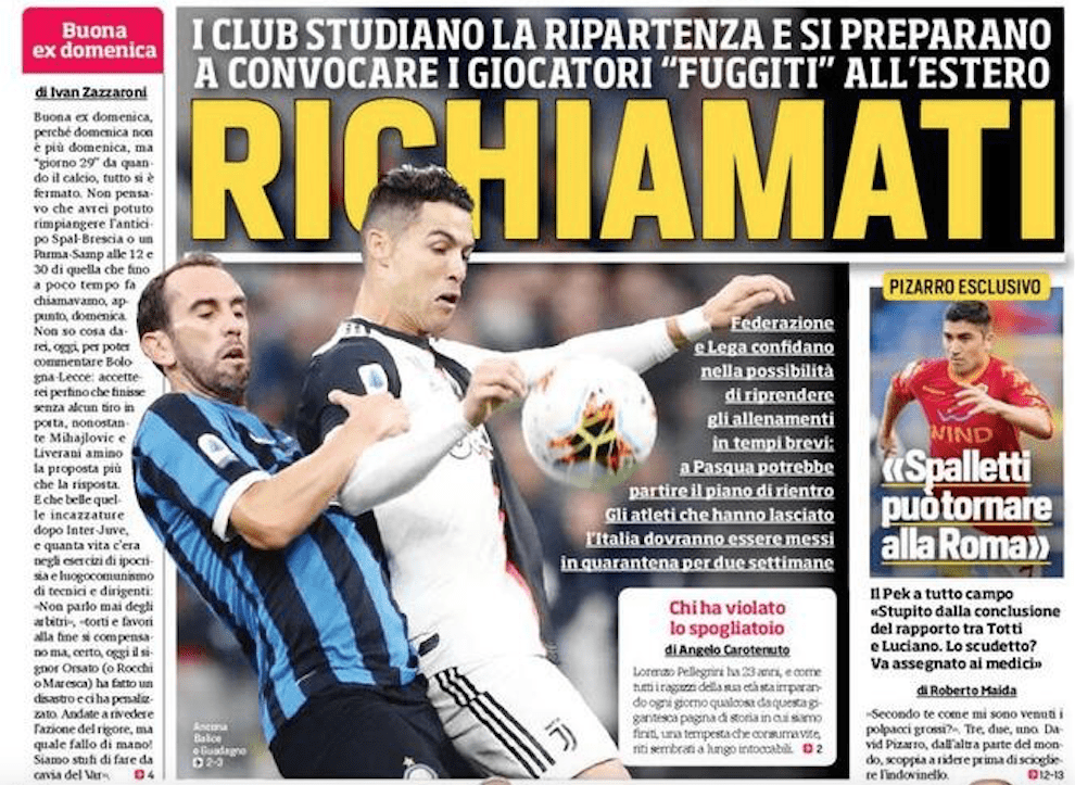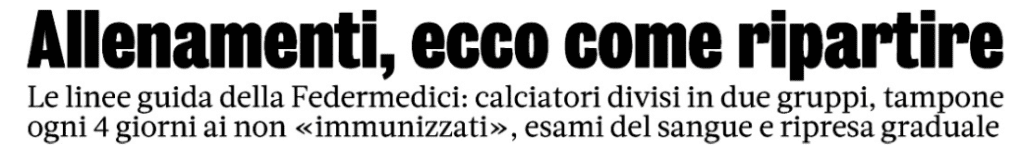 A fine settimana è previsto un nuovo incontro fra il presidente FIGC Gravina e il ministro dello sport Spadafora, nel quale si valuterà la possibilità di riprendere gli allenamenti in sicurezza, primissimo passo per poter ricominciare i campionati nazionali. Il secondo sarà riavere a disposizione tutti i giocatori tornati nei rispettivi paesi d’origine, quando ancora in tempo per lasciare l’Italia prima della chiusura totale. Un’idea comune di tutte le 20 squadre di Serie A, a maggior ragione qualora si riprendesse a giocare il 20 maggio per finire ai primi di luglio, è di un maxi-ritiro che duri fino all’ultima giornata. Saranno poi necessari test medici per valutare l’idoneità e la negatività di tutti i tesserati al COVID-19. Quanto ai tamponi, difficile possano essere fatti prima di ogni partita: “difficile crederlo anche solo per una questione di tempo” sottolinea il Corriere dello Sport. La Gazzetta delinea invece i due gruppi in cui verrebbe divisa ogni squadra: uno composto da positivi o calciatori con sintomi riferibili al virus e uno dai negativi o senza sintomi. La commissione scientifica della FIGC ha già disposto numerose raccomandazioni per ridurre al minimo l’eventualità di avere un nuovo caso di contagio in una squadra, cosa che di fatto cancellerebbe definitivamente il campionato 2019/2020.