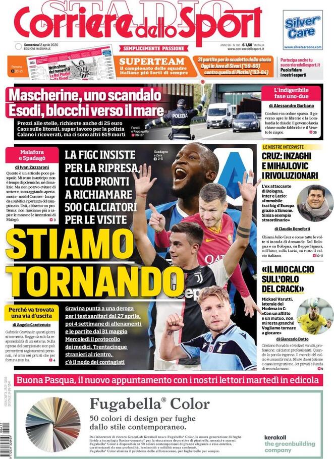 Serie A e FIGC dettano la linea per la ripresa, pronte a richiamare alla base i giocatori ancora in quarantena nei rispettivi paesi per sottoporre poi circa 500 professionisti a test di idoneità sportiva già tra il 24 e il 27 aprile. La data designata per le prime partite? Il 31 maggio. Da mercoledì sarà disponibile il protocollo con le misure sanitarie chieste a gran voce dal ministro dello sport Spadafora dopo l’ultimo dpcm: previsti test molecolari e sierologici, esami respiratori e cardiologici. I giornali si dividono negli editoriali: se il Corriere dello Sport incoraggia una “rapida e salvifica” ripresa dei campionati cercando di svelare i retroscena dietro al botta e risposta di qualche giorno fra tra Gravina (“che negli ultimi tempi ha tirato fuori due palle grandi come l’Olimpico”) e Malagò, sulle pagine di Tuttosport viene definito “assurdo e irrispettoso” lo spettacolo offerto dai presidenti di Serie A, ognuno con i rispettivi interessi. Il campionato va finito per evitare un bagno di sangue economico, ma i tempi li detterà il virus. Una parte delle perdite potrebbe venire coperta dall’utilizzo di un centinaio di milioni, l’1% dei ricavi derivanti dalle scommesse nell’anno 2019, pari a 10,7 miliardi. Per il momento è battaglia fra gli operatori, con il governo che invece valuta la proposta arrivata dal numero uno della Lega Pro Ghirelli, intervenuto sulle pagine del quotidiano torinese per ribadire i tanti gesti di solidarietà profusi dalla Serie C, “il calcio che fa bene al paese”.