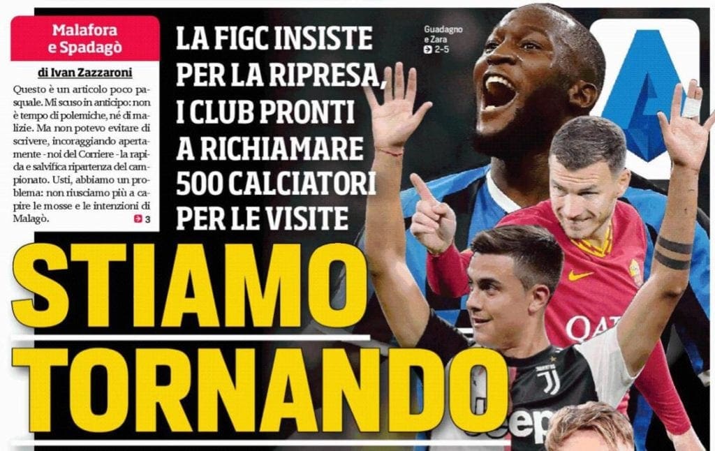 Serie A e FIGC dettano la linea per la ripresa, pronte a richiamare alla base i giocatori ancora in quarantena nei rispettivi paesi per sottoporre poi circa 500 professionisti a test di idoneità sportiva già tra il 24 e il 27 aprile. La data designata per le prime partite? Il 31 maggio. Da mercoledì sarà disponibile il protocollo con le misure sanitarie chieste a gran voce dal ministro dello sport Spadafora dopo l’ultimo dpcm: previsti test molecolari e sierologici, esami respiratori e cardiologici. I giornali si dividono negli editoriali: se il Corriere dello Sport incoraggia una “rapida e salvifica” ripresa dei campionati cercando di svelare i retroscena dietro al botta e risposta di qualche giorno fra tra Gravina (“che negli ultimi tempi ha tirato fuori due palle grandi come l’Olimpico”) e Malagò, sulle pagine di Tuttosport viene definito “assurdo e irrispettoso” lo spettacolo offerto dai presidenti di Serie A, ognuno con i rispettivi interessi. Il campionato va finito per evitare un bagno di sangue economico, ma i tempi li detterà il virus. Una parte delle perdite potrebbe venire coperta dall’utilizzo di un centinaio di milioni, l’1% dei ricavi derivanti dalle scommesse nell’anno 2019, pari a 10,7 miliardi. Per il momento è battaglia fra gli operatori, con il governo che invece valuta la proposta arrivata dal numero uno della Lega Pro Ghirelli, intervenuto sulle pagine del quotidiano torinese per ribadire i tanti gesti di solidarietà profusi dalla Serie C, “il calcio che fa bene al paese”.