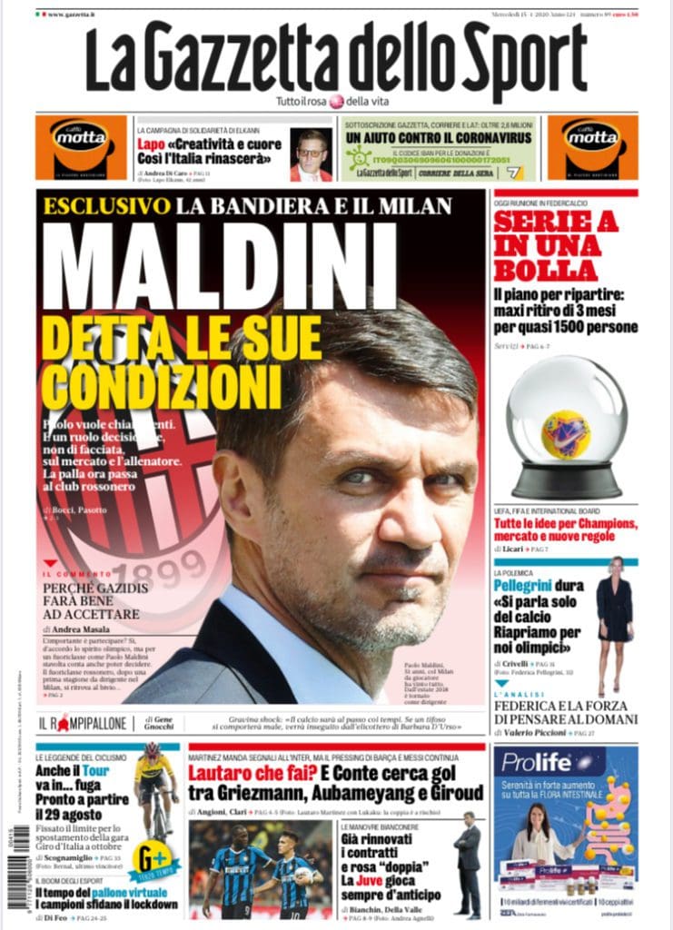Sempre tra le pagine del quotidiano in rosa parla il direttore scientifico dell’Ospedale “Spallanzani” di Roma, Giuseppe Ippolito, che torna sul tema dei tamponi ai giocatori e sulle tanto discusse patenti di immunità. “Non esistono patenti di immunità e non è etico far fare sierologie e test ogni pochi giorni agli atleti. Questo mentre i pazienti e il personale sanitario non riesce a farli“.