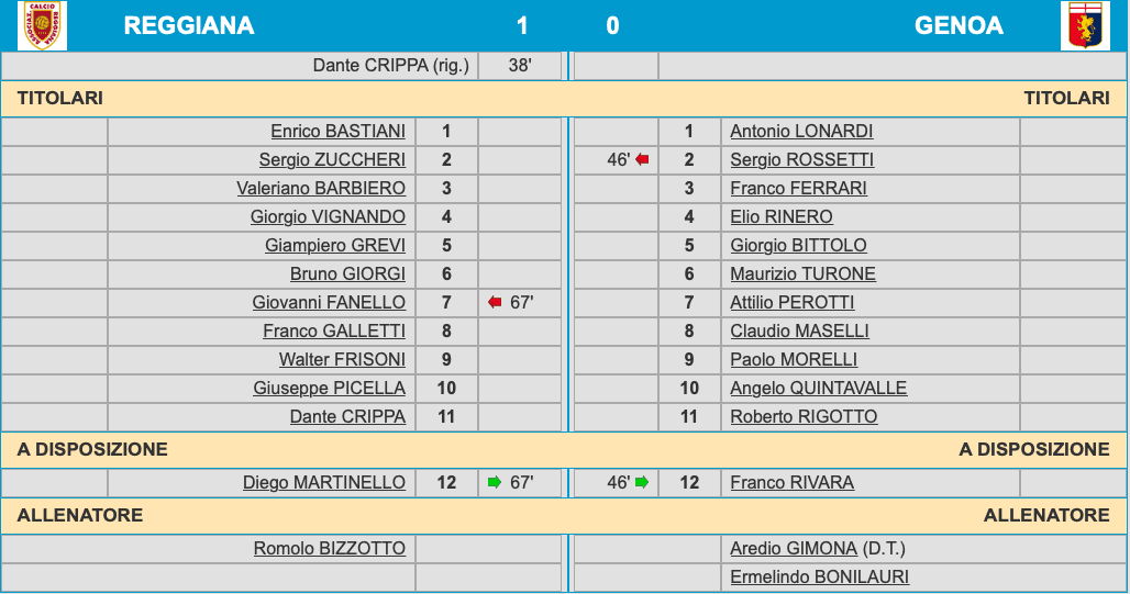 presentò in questa ultima giornata di campionato come ultimo in classifica, però ci fu la solita marea di tifosi che partirono per andare a vederlo giocare a Reggio Emilia. Di solito, soprattutto quando si andava lì, si faceva qualche gita culinaria: arrivammo in questo ristorante alle 11.30, ci fecero entrare, però siccome eravamo tanti non finimmo all’una come avevamo previsto ma circa alle 13.30. Andammo al Giglio di Reggio Emilia, tutti cantavano e non c’era pericolo perché la Reggiana era ad uno o due punti più del Genoa. C’era anche il Piacenza che aveva due punti.