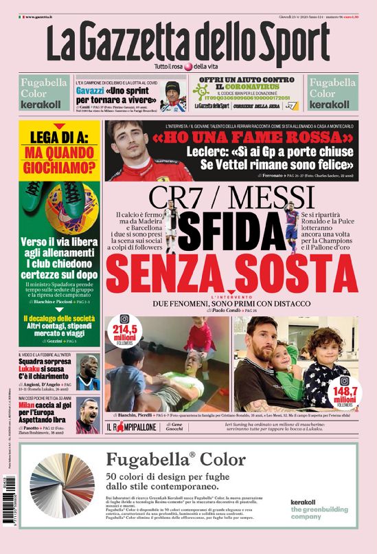 IL SECOLO XIX – Il quotidiano genovese, che dedica ampio spazio alla “melina” fra il Governo e la Serie A in vista di una ripresa degli allenamenti, ribadisce come la data più probabile vada ben oltre il 4 maggio e che quella del 18 sia probabilmente l’ultima utile per portare a compimento i campionati entro e non oltre la deadline che la UEFA è pronta a stabilire. Criscito mette all’asta le fasce da capitano e una maglietta dello Zenit, fra i promotori così come Perin delle aste benefiche a sostegno dell’Ospedale San Martino. 12mila euro sono arrivati dal tifo organizzato, così come mascherine e dispositivi di protezione individuale. Ranieri è fra i pochi (insieme ai soli Cairo e Cellino) a parlare chiaramente mettendo così a nudo l’ipocrisia che regna sovrana nel mondo del calcio: è lui il saggio fuori dal coro, guidato da grande esperienza e saggezza.