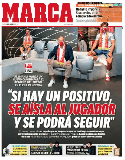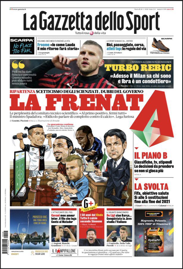“Scetticismo degli scienziati e dubbi del governo” su protocolli sanitari e ripartenza secondo la Gazzetta dello Sport, che sottolinea come qualora venisse riscontrata la positività di un solo giocatore al Coronavirus si fermerebbe nuovamente tutto il movimento. Situazione ben diversa in Germania, dove il campionato (stando a quanto confermato ieri dai vertici della Bundesliga) proseguirà anche in caso di contagio. Conquistandosi anche la prima pagina del madrileno Marca. Il presidente degli arbitri Marcello Nicchi dà il 50% di possibilità di ripresa, su un campione di 1000 italiani il 64% si dice favorevole allo stop definitivo della stagione.