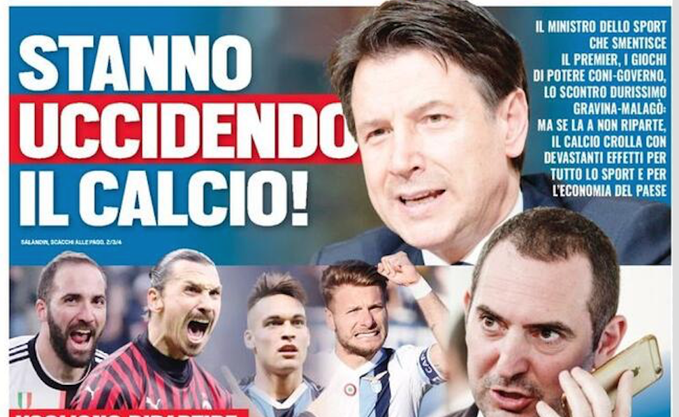 Le prime pagine sono probabilmente le più dure dall’inizio del lockdown in Italia e per il mondo del pallone: “Stanno uccidendo il calcio” titola Tuttosport, “La Lega va all’attacco di Spadafora” sostiene il Corriere. “Il calcio è sul lastrico e attacca il governo” scrive Repubblica, prima di aggiungere come il fallimento di 10 società su 20 sarebbe un rischio concreto se si ridimensionasse il sistema. Anche La Stampa insiste sul “braccio di ferro”.
