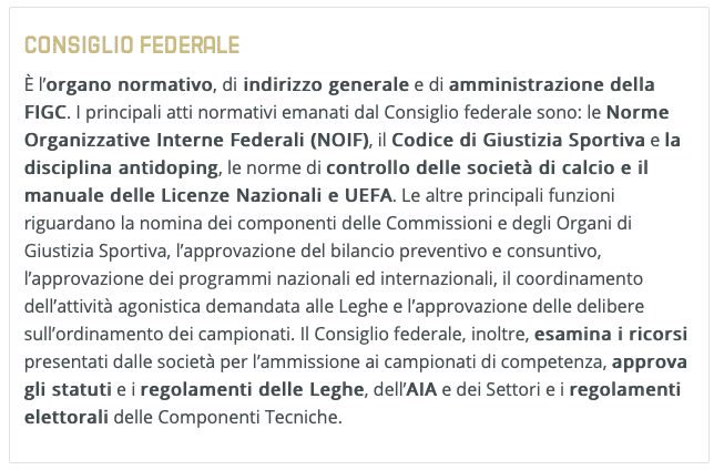 Il Consiglio Federale, composto da 20 consiglieri, avrebbe facoltà di modificare o emendare gli articoli del NOIF (l’ultima volta è avvenuto lo scorso 10 marzo per il tema delle licenze nazionali), ma solo su proposta del Presidente Federale. Il Consiglio, infatti, “coordina l’attività agonistica demandata poi alle Leghe” e delibera d’intesa con le medesime leghe, con la maggioranza di tre quarti dei componenti aventi diritto di voto, “sull’ordinamento dei campionati e sui loro collegamenti, con particolare riferimento ai meccanismi di promozione e retrocessione“. In altre parole, se si decidesse di modificare il format del campionato di Serie A per assicurarne la conclusione, magari introducendo playoff o playout, si dovrebbe passare dal Consiglio Federale, che il 24 febbraio scorso ha eletto come vicepresidente Paolo Dal Pino, attuale presidente della Lega Serie A, che è andato a unirsi agli altri due consiglieri che facevano già parte del Consiglio: Claudio Lotito e Giuseppe Marotta.