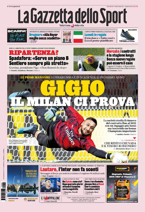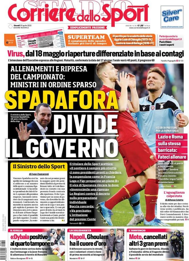 Continuano a far discutere i principali quotidiani sportivi nazionali le dichiarazioni del ministro dello sport Vincenzo Spadafora, che ieri mattina ha lanciato un nuovo messaggio a Serie A e Federcalcio invitando i presidenti a “pensare a programmare la prossima stagione”. Il Corriere dello Sport parla di atteggiamento “sinistro” che non si addice a un ministro e rischia di spaccare la Lega. Brescia e Torino – ieri Repubblica inseriva anche Genoa e Samp, secondo Tuttosport c’è anche il Cagliari – Restano contrarie alla ripresa del campionato, ma la Lega Serie A conta di riportare tutte le squadre sul fronte del “sì” entro domani, quando si terrà la riunione straordinaria indetta ieri. La Gazzetta scrive di una strada in salita, di spiragli che sono diventati “sentiero sempre più stretto” e sottolinea la possibilità di un asse europeo con la Francia, l’edizione odierna di Repubblica pone l’attenzione sulla volontà della UEFA di portare a termine Champions ed Europa League a prescindere dalle scelte dei vari campionati nazionali: di fatto si tratterà già di una “superlega”. Tuttosport innalza Ciro Immobile al ruolo di “ministro per lo sport” dopo la presa di posizione contro il divieto di allenamenti individuali all’interno dei centri sportivi – da lunedì prossimo permessi nei parchi – prima del 18 maggio. Su questo punto il ministro Boccia apre uno spiraglio, ammettendo come su quel punto il decreto debba venire precisato.