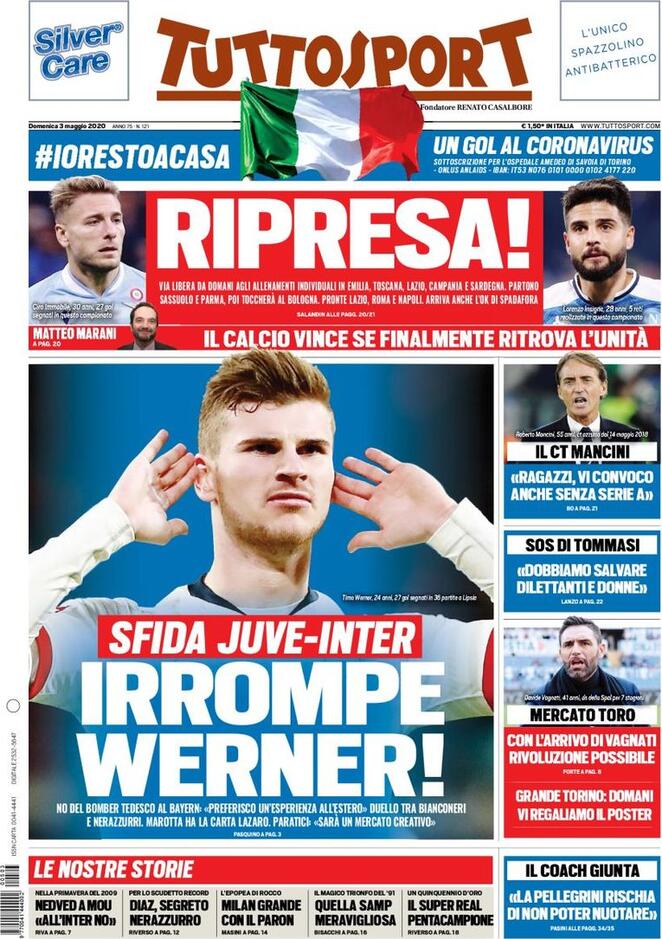 “Il calcio è un nostro patrimonio e bisogna tutelarlo” sostiene il presidente dell’Emilia-Romagna Bonaccini in un’intervista rilasciata al Corriere dello Sport, che in prima pagina inneggia proprio alle regioni elogiandone la scelta fuori dal coro di dare il via libera (da lunedì) agli allenamenti in forma individuale nei centri sportivi. Spadafora costretto a cambiare decisione? Secondo Repubblica questa scelta potrebbe avere delle ripercussioni, motivo per cui nella giornata di mercoledì non è da escludere che il premier Conte annunci la fine del campionato di Serie A sulla scia di quanto già fatto di recente dalla Francia. Per Tuttosport l’obiettivo è quello di ripartire con gli allenamenti di squadra già dal prossimo 18 maggio, mentre Agnelli fa pressing per tornare in campo al suono di “ricominciamo”. Gazzetta dello Sport: Spadafora e Speranza fra i più duri, contrari alla ripartenza, il presidente del Consiglio resta dubbioso mentre a chiedere una riflessione prima di staccare la spina (i cosiddetti “aperturisti”) sono principalmente all’interno del Partito Democratico.