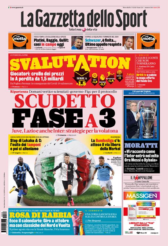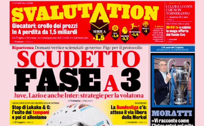 Mentre Tuttosport si concentra prevalentemente sulla ripresa della Juventus che “sgomma” e nella parte dedicata alle genovesi parla soprattutto della ripresa della Sampdoria (oggi comincia la fase 2 blucerchiata), la Gazzetta dello Sport si concentra invece su altre tematiche, togliendo un po’ di centralità alla decisione che oggi prenderà la Germania. Si parla di “SvAlutation“, ovvero sia di una valutazione dei giocatori della Serie A calata complessivamente di un miliardo e mezzo, e si annuncia una “fase a 3” per lo scudetto. Inoltre, viene dedicato spazio anche all’offerta del fondo britannico CVC alla Serie A. Si parlerebbe di 15 miliardi per assicurare un futuro al mondo del pallone italiano. Anche se, si legge, club e società avranno “conti che non torneranno“.
