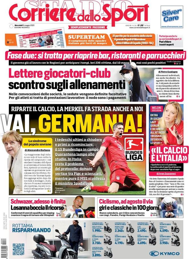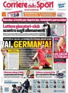 Le prime pagine odierne sottolineano diverse notizie, a partire da quella che descrive l’Italia calcistica come in attesa delle decisioni che verranno prese oggi in Germania, dove c’è grande attenzione per il discorso della Cancelliera Merkel. Il Corriere dello Sport scrive “Vai Germania“, abbozzando già il 15 maggio come data di ripartenza del campionato tedesco. Una ripartenza che potrebbe accelerare anche le decisioni in casa italiana, dove il Ministro Spadafora incassa le critiche non soltanto dell’opposizione (Matteo Salvini su tutti), ma anche della sua stessa maggioranza (Matteo Renzi) e del suo stesso partito, come testimonia il messaggio Facebook del pentastellato Simone Valente. “Il calcio rappresenta un asset fondamentale del sistema Paese, a livello sportivo, economico e social. L’impegno delle istituzioni deve andare nella direzione di salvaguardare l’intero sistema, cercando di non fare fallire neanche una società, senza ritenere antagonisti il movimento professionistico e quello dilettantistico. Demonizzare l’uno in favore dell’altro significa non avere coscienza del settore o non essere onesti intellettualmente“).