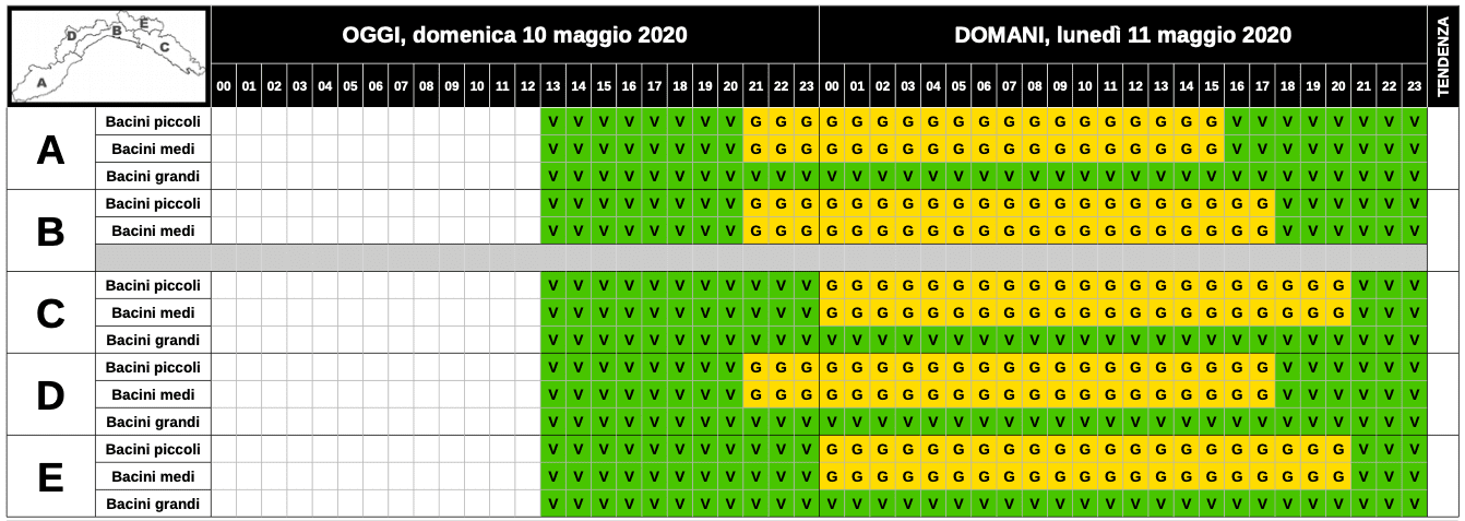 A partire da questa sera alle ore 21 e per le successive ventiquattro ore, sino alle ore 21 di lunedì 11 maggio, Protezione Civile e Arpal hanno diramato l’allerta gialla meteorologica su tutta la Liguria. “A partire dalla serata odierna sono attese precipitazioni diffuse associate a episodi di carattere temporalesco anche di forte intensità, che interesseranno la Liguria da Ponente in estensione a Levante. In corrispondenza dei fenomeni più intensi saranno possibili risposte repentine del reticolo idrografico minore, associate ad allagamenti localizzati e fenomeni di rigurgito dei reticoli fognari in ambito urbano“.