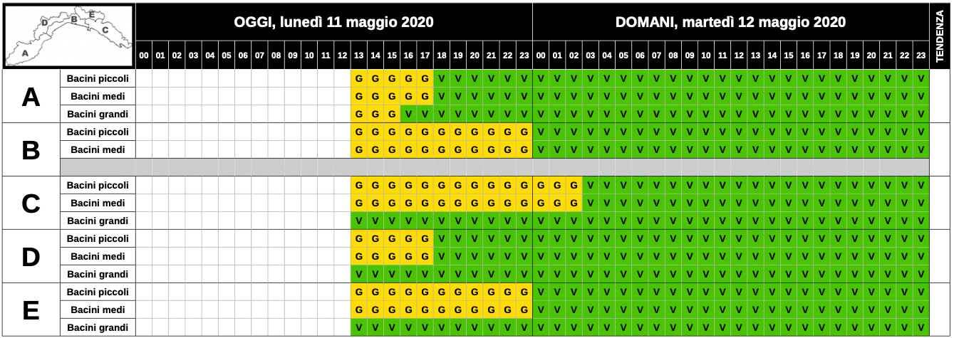 Prolungata sino alla mezzanotte l’allerta meteo gialla estesa a tutta la regione Liguria. Il passaggio di un fronte temporalesco si esaurirà primariamente sul Ponente e si prevede che il termine dell’allerta, sui versanti B ed E, cesserà entro la mezzanotte di questo lunedì 11 maggio. Si estenderà nella notte tra lunedì e martedì, con termine alle ore 3, sul versante C relativo alla provincia de La Spezia.