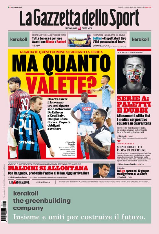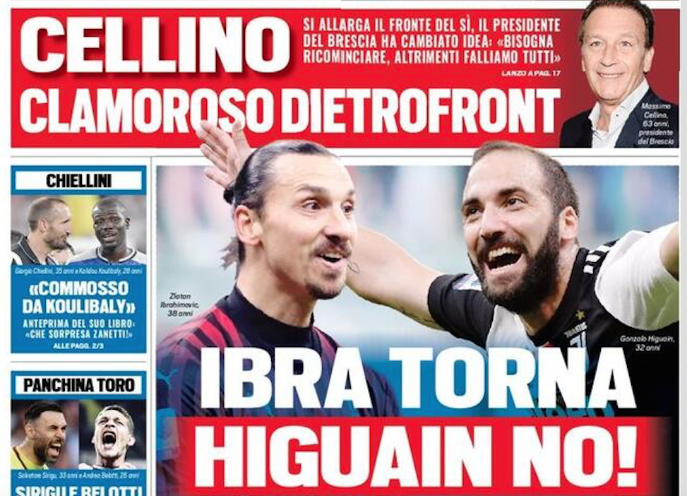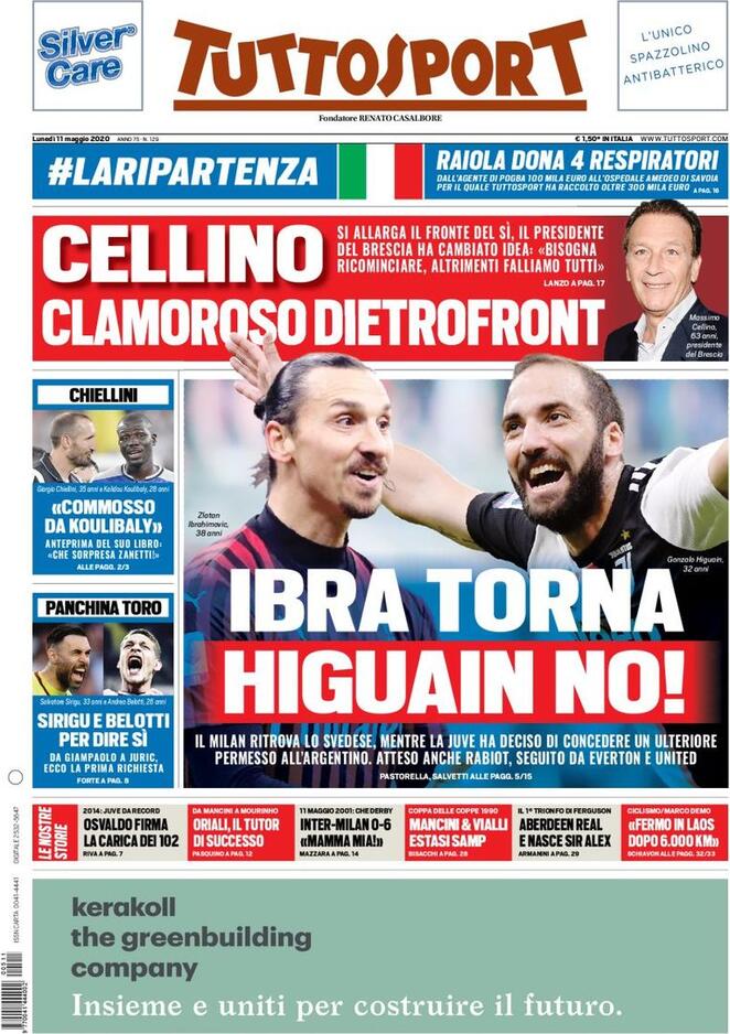 È ora di decidere. Mentre calano anche in Lombardia nuovi positivi e decessi per Coronavirus, la Serie A attende il via libera agli allenamenti di gruppo dal comitato tecnico-scientifico. Il nodo più intricato resta quello della quarantena per tutta la squadra in caso di positività registrata anche solo da un tesserato: possibile un allentamento delle misure a partire da giugno? Tuttosport inserisce in prima pagina il clamroso dietrofron di Cellino e rivela: la Juventus ha concesso a Gonzalo Higuain qualche giorno in più in Argentina. È scontro totale con le televisioni, come sottolineato dal Giornale: Sky non ha ancora pagato la rata tanto attesa da società e FIGC, Lotito e De Laurentiis sarebbero pronti a far causa.