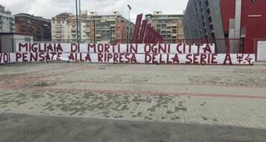 Gli Ultras del Torino, così come fatto da tanti altri gruppi delle tifoserie organizzate italiane nei giorni scorsi, hanno manifestato la loro netta contrarietà alla ripresa dei campionati di calcio appendendo due striscioni ai cancelli dello stadio Filadelfia. “Migliaia di morti in ogni città e voi pensate alla ripresa della Serie A“, recita uno stendardo, accompagnato da un secondo messaggio ancora più eloquente: “Il vero virus da debellare siete voi che volete tornare a giocare“.