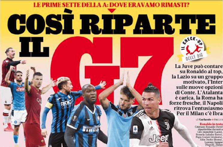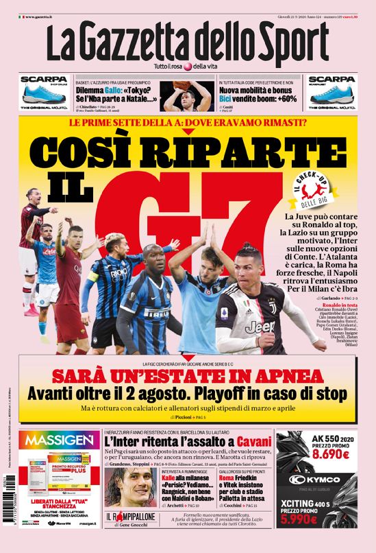 Il Corriere dello Sport attacca Spadafora, accusandolo di aver snobbato un dossier su piani d’investimento miliardari per gli stadi di 12 società italiane. Un piano da 2,5 miliardi che avrebbe dato lavoro a 50mila persone, garantendo la crescita della Serie A sul livello di Bundes e Premier League. La Gazzetta si concentra sulle prime 7 del campionato, poi sulle 124 partite che mancano da disputare. In campo anche oltre il 2 agosto, ma in caso di nuovo stop resta viva l’ipotesi playoff. “Privilegiare allenamenti con la palla e lavoro a secco di alta qualità, neuro-muscolare, mentre durante il campionato sarà fondamentale la gestione dei recuperi” è il consiglio dell’ex preparatore atletico Bonocore.