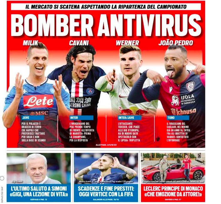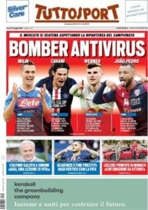Un trafiletto si concentra anche sulle dichiarazioni del Ministro Spadafora, con la giornata di giovedì prossimo che si annuncia fondamentale per le sorti della Serie A. Un secondo, e più breve, trafiletto parla invece dell’involuzione di Piatek, finito in panchina allerta Berlino.