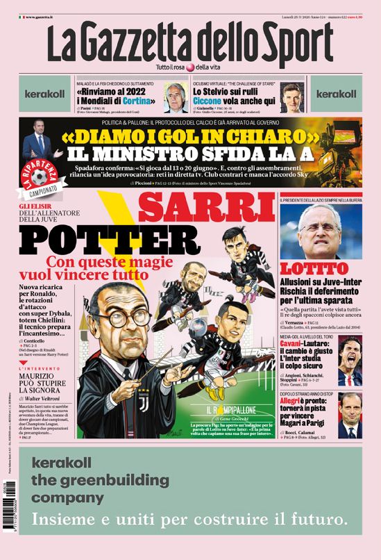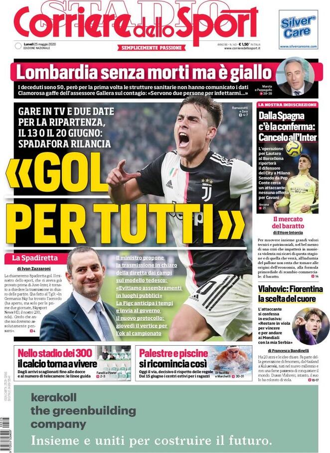 Tanti argomenti all’ordine nel giorno in questo lunedì 25 maggio. Anzitutto si parte dal “rilancio” del Ministro Spadafora, che dopo aver confermato ieri che il 13 oppure il 20 giugno dovrebbe ripartire la Serie A, ha chiesto a gran voce che le gare vengano trasmesse in chiaro. Il Corriere dello Sport titola “gol per tutti“, la Gazzetta dello Sport scrive “diamo i gol in chiaro: il Ministro Spadafora sfida la A“. Tuttosport si focalizza in prima pagina sul calcio che verrà, in particolare sulla girandola degli attaccanti.