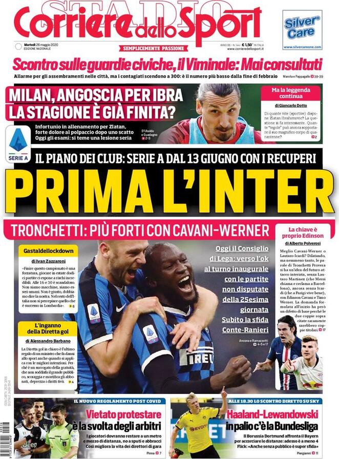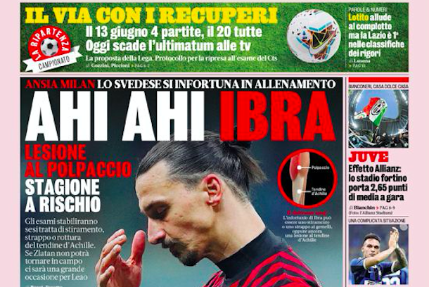 Questa mattina le prime pagine dedicano spazio all’infortunio di Zlatan Ibrahimovic in allenamento, stop che potrebbe avergli fatto terminare la stagione in anticipo rispetto alle previsioni. Ma non è soltanto l’attaccante svedese a rappresentare l’argomento di punta: lo sono anche le vicende legate alla Serie A.